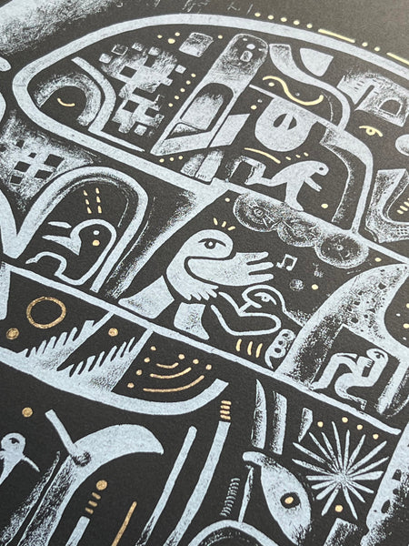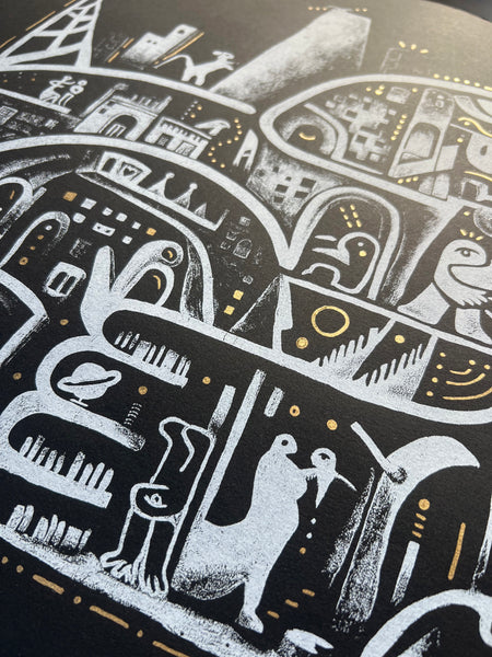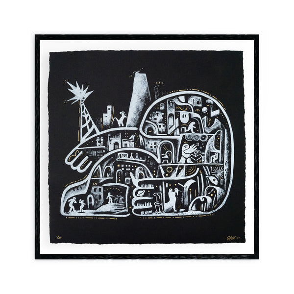 Size: 18" x 18" Signed and Numbered to /20 White ink screen printed on heavy black paper with hand-torn edges, hand embellished with gold ink. Gallery ready, designed for framing