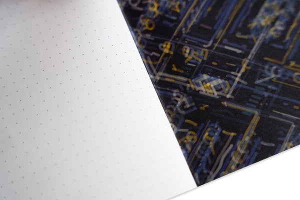 Pocket-sized sketchbook featuring artwork from Efdot’s Cities collection. Four original pieces wrap the notebook, appearing on the front, inside cover, back, and back inside cover. They are ready for whatever creativity awaits.